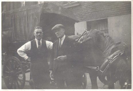 Then Photos which tell of family occupations, this one taken in 1931, my Dad home on leave from India with His Dad and horse and cart outside the family home in Lundy Street, Fulham, he was a Greengrocer and went to Covent Garden every morning.