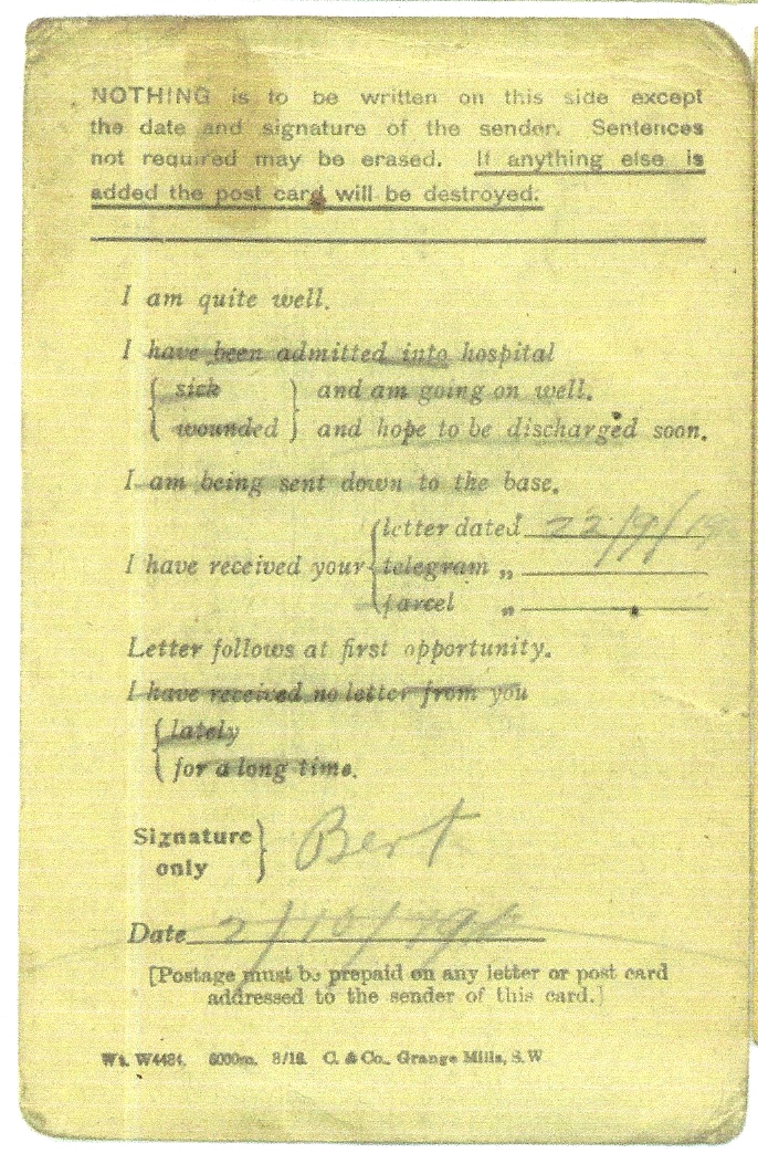 Just a few lines in answer to you most kind and welcome letter, which I was very pleased to receive in the trenches and glad to hear that you are in the best of health and glad to say that I am myself at the time of writing Well mate I am very sorry that I have not answered your letter before as we have not had much time for ourselves just lately travelling in and out of the trenches Well Dan, you say you are at Lyon’s now and have got a better job than the last one so I am very glad to hear it and hope that you get on You say that you have got a managers job pushing a truck about all the night not like the job out here pushing Old Fritz about but never mind I hope it is soon all over so that we can get back on the old job again Dear Dan I expect that you are amongst plenty of the pushers or girls now, so don’t forget Bert for one the spare addresses so that I can write to one Well Mate I think that this is all for this time so write quick as that is all we look for now in these trenches and that is letters from good Old Blighty. Must now close with the best of luck.