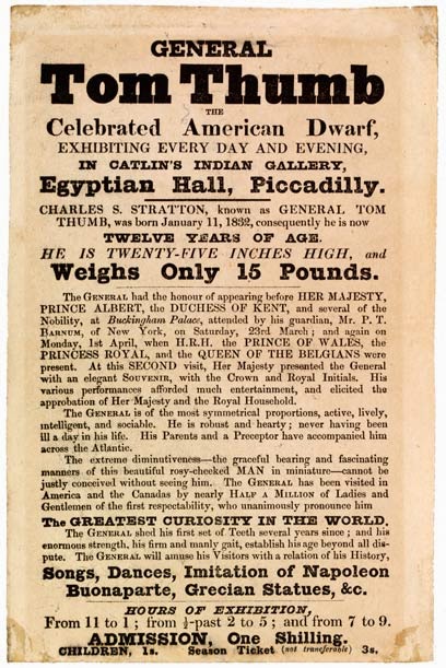 Discovered and made famous by P.T.Barnum (Phineas Taylor Barnum)… From age four, Barnum taught Charles to sing,dance, mime, and impersonate famous people. Barnum also went into business with Stratton’s father, who died in 1855. Stratton made his first tour of America at the age of five, with routines that included impersonating characters such as Cupid and Napoleon as well as singing, dancing and comical banter with another performer who acted as a straight man, It was a huge success and the tour expanded.