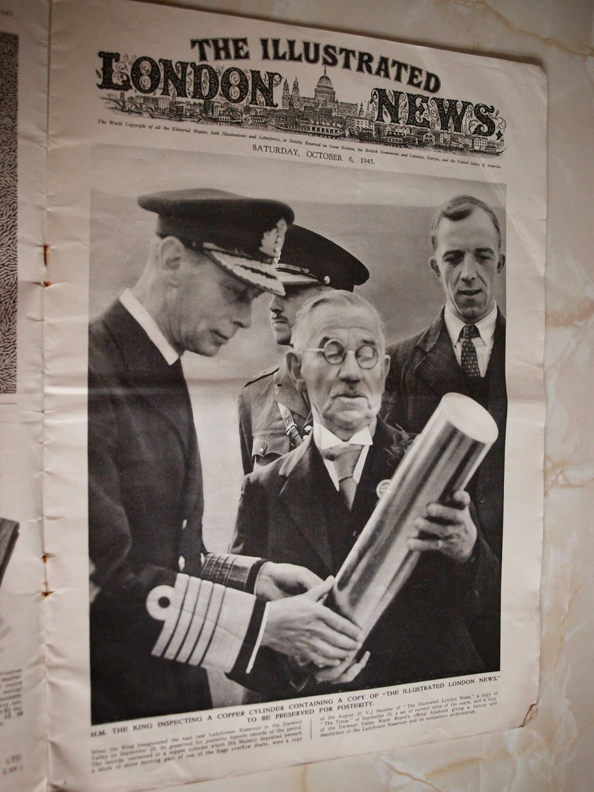 This copper cylinder shown above, was placed in a block of stone forming part of the huge overflow shafts at the new Ladybower Reservoir in the Derwent Valley on September 25th.
