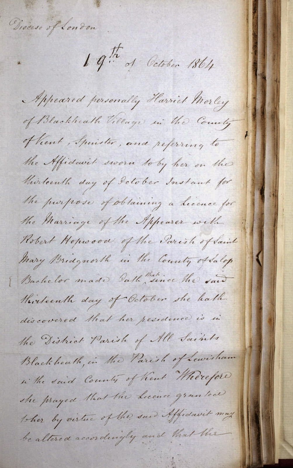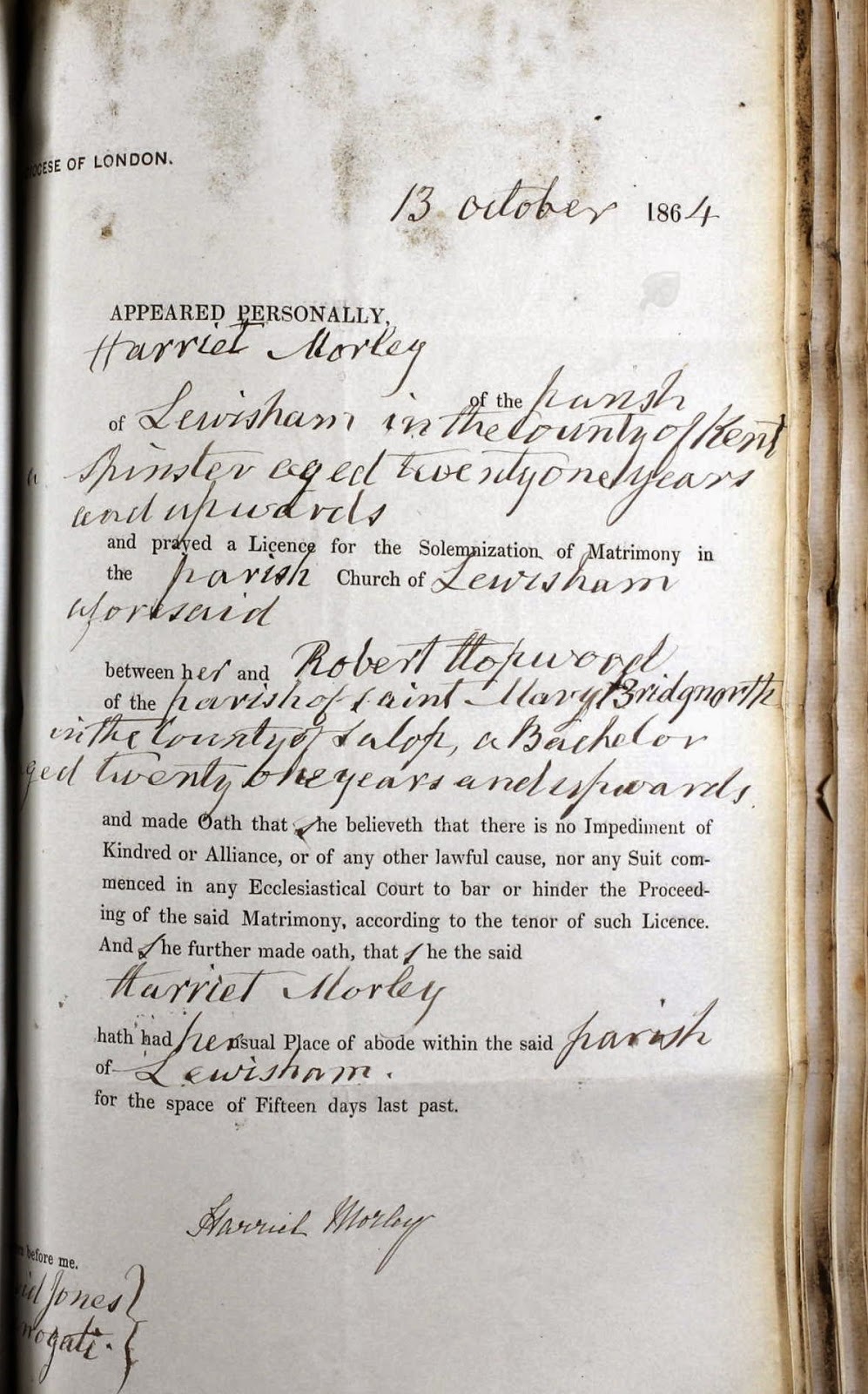 In late 1864 Robert Hopwood married Harriett Morley in London, these documents (sourced from Ancestry) are interesting relating to their marriage and change of residence for Harriett at the time………….