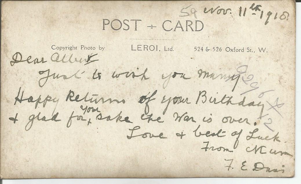 On the second card we find out she was a Mum……With a Son called Albert, who was old enough to go to war, in WW1 we assume, and on this card to Albert she signs it F E Davis..so married name……..On that same card, the back of the Postcard photo has Oxford Street, London just below the date.