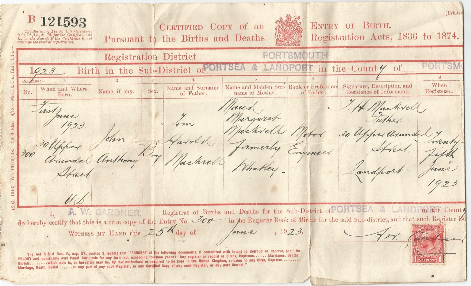 Yes, the birth certificate found was for John Anthony mackrell , known as tony, who is now resting in Dartford besides his wife, jean. He was my great uncle.