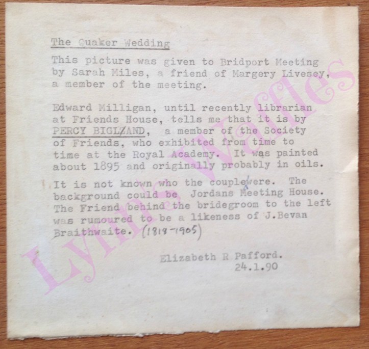Thank you for your blog. I have seen much of this on other sites and through family history, but some was new to me. My parents and when she came to visit us in the US (Angela Fox Bradford, granddaughter of the artist) saw the original hanging at Swarthmore PA. I am a great granddaughter of Percy Bigland, granddaughter of Ranulf Aggs Highland, who had one daughter, Brenda Bigland Ritchie age 90 (widow of J. Murdoch Ritchie now deceased; two children, myself and my brother). This blog is great. The back of my version of the Quaker Wedding (given to me by my 2nd cousin granddaughter of “G” (never known as Griselda) Bigland Fox – which came with a list of who is portrayed. My understanding is it is representative of Quaker weddings of the era (much earlier than Percy’s lifetime I believe) and that the faces of the people were based on Percy’s contemporaneous friends (usually Friends) and their children. I may have to join Ancestry. I’m not surprised about the amount of information as my grandfather and those before him had been interested in genealogy.