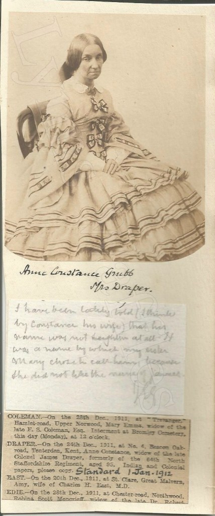 6. Anne Constance. Known as Constance in the family, Anne Constance Grubb was born on 28 October 1816 in Horsenden, Buckinghamshire. She married James (Leighton) Draper on 26 November 1844 at St Margaret’s, Westminster. They had one child during their marriage, a daughter, Mary Constance Rosalie b 1856 d 1927 (she never married & had no children). Anne Constance died on 24 December 1911 in Tenterden, Kent, at the impressive age of 95.