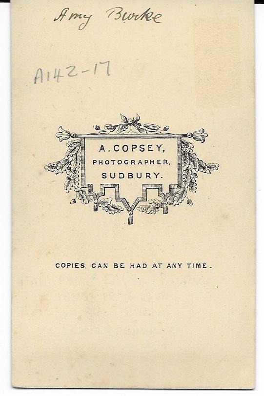 13. Anne Eliza Burke was born on 10 Nov 1855 in Paddington, Middlesex, England. She died in Apr 1876 in Sudbury, Suffolk. Again, just a short notice of her death in the local newspaper dated 10 June 1876, The Ipswich Journal: Burke. 3rd inst at The Auberies, Essex. Anne Eliza (AMY) youngest child of James St George Burke Esq. Q.C., in the 21st year of her age. Checking in other newspaper reports, they all say she was known as AMY, so is this lovely photo I found of her? It seems very likely.