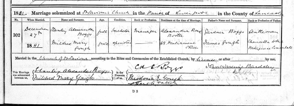 Then later that year on the 27 Dec 1881 at St Saviours Church, Liverpool she married Alexander Stanley Boggs, he was known as Stanley, and was a Corn Merchant in Liverpool, he was the son of Gardner Boggs, an East India Merchant and Charlotte Boss (Ayre)