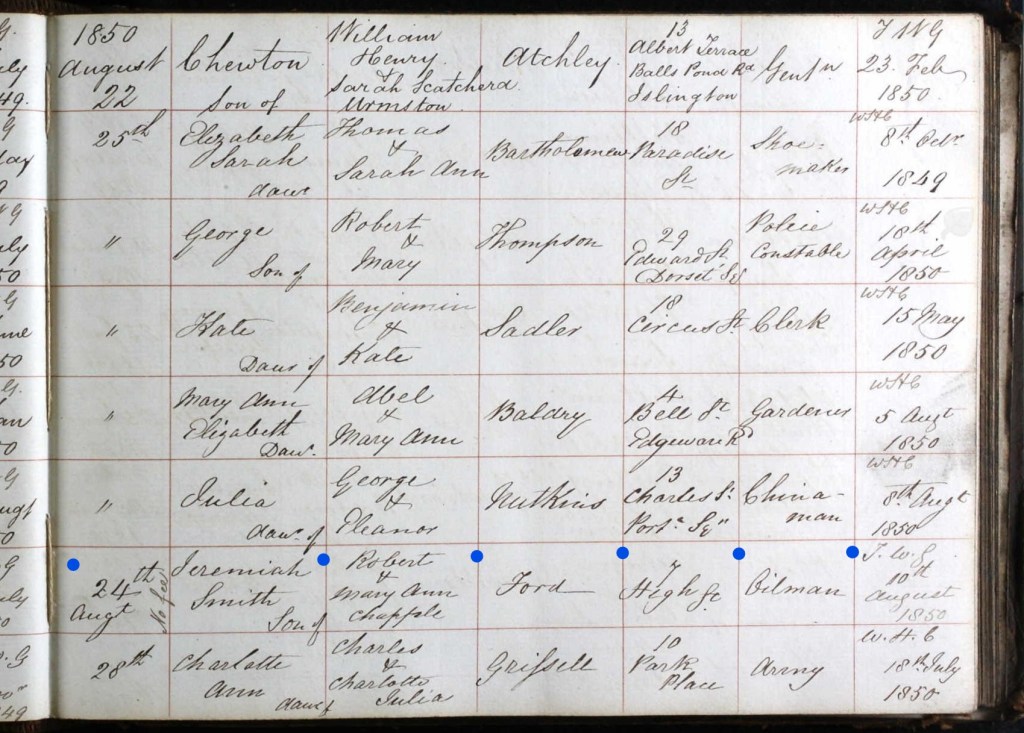 4) Emma was fourth born on the 18 March 1848 in Marylebone. She like her sister Clara never married, the family seemed to all look after and kept in close touch. Living together in the census and Emma was with her brother and sister in the 1911 census in the Fried Fish business. I believe she died in April 1916 in Marylebone, it seems the most likely although I cannot be sure without a certificate. 5) Jeremiah Smith Ford was born on 10 August 1850, the birthdate was helpfully on the baptism record. Also on the baptism record it says ‘No Fee’ was this because he wasn’t expected to live? He sadly died aged just 7 months in March of the following year. I found 2 baptism records for Jeremiah but just one says no fee. The second is a copy in another book and this was not added.