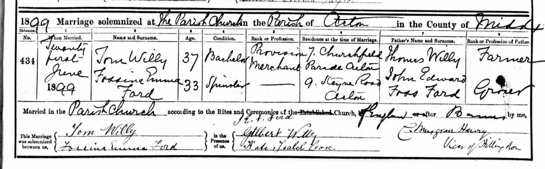 In 1871 John EFF described as a Tea Dealer lived at 32 Boundary Road, Hampstead with his wife and daughter and a couple of lodgers. 1881 The family are living at 9 Steyne Road, Acton, Middlesex. John EFF a Grocer and they have no lodgers now. Fossina is now 15. 1891 finds Fossina aged 25 and still living with her parents at 9 Steyne Road, John EFF is a Grocer.Then on 21 June 1899 at St Mary’s Church, Acton she married John Willy. John had been born in the small hamlet of Sea, Ilminster, Somerset. As you can see below Tom Willy was a provision merchant, so likely Fossina met him through her fathers Grocer’s business……and so another chapter of the family begins……..