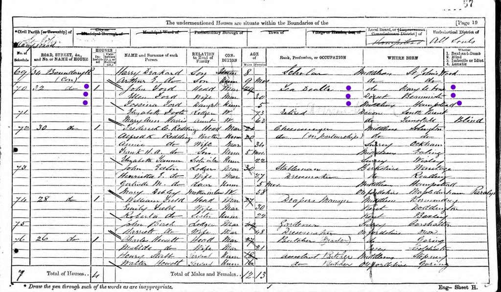 John Edward Foss Ford A Scholar not a servant as stated on Ancestry. There are Visitors at the address but not his own immediate family. They are William Ford, a retired Silk Mercer(Merchant)b Devon plus Mary Ann Ford(wife) and a child Warwick Ford and Henry Ford. So likely relations on his fathers side as they are Devon born. John Edward FF’s parents Robert and Mary Ann with little sister Emma were staying not too far away in Norwood, Southall Green at the home of Farmer Henry P Baxter, Robert is described as an Uncle to the Head. In 1861 John EFF is living as head of household at 29 Boundary Road, Hampstead sister Clara is living with him. He is described as a Grocer and Shipman.