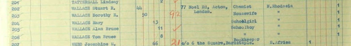 After searching through the records again I was so lucky to find this record below confirming what I had found on the public tree was correct! Dorothy with husband Stuart Bruce Wallace 44 (A Chemist) and 3 children Mary Wallace 13, Alan Bruce Wallace 11, Tom Bruce Wallace 8. Going to stay at 77 Noel Road, Acton, London. This was the home of her brother Thomas and his wife Mary and Mum Fossina was living next door with her daughter Mary, how lovely that Fossina saw all the family from Africa before she died in December 1952.