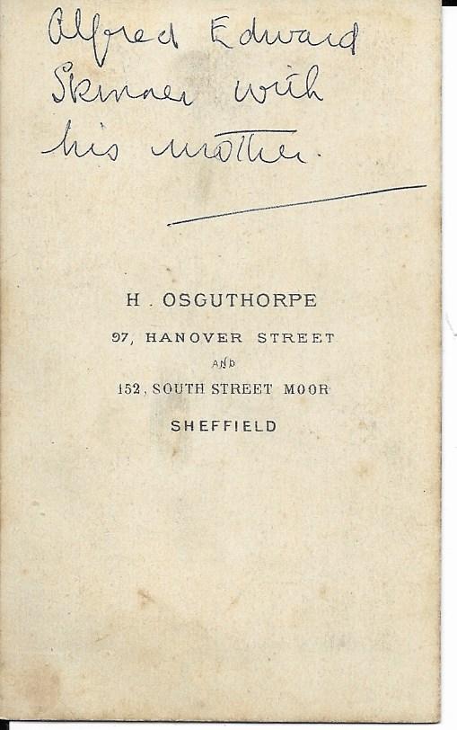 Mary Eliza Bramwell was married at aged 20 to Alfred Skinner in Sheffield, Yorkshire. At the time of the 1871 census Alfred was a Warehouseman and they had one son John Walter Skinner born in 1868.They lived in Pomona Street, Ecclesall, Sheffield. 1881 sees the family living at Langdon Street, Ecclesall, Sheffield, Alfred is now described as a Sub Manager for Electro Plate company. They also had another son Alfred Edward Skinner born in 1876, too late for this photo. So my theory is that whoever wrote on the back of this CDV in slightly more modern times thought it was Alfred Edward and I think it was likely to have been John Walter born in 1868 with his Mum, Mary Eliza.