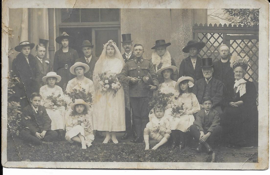 Lovely Wedding group taken outside, groom wearing his Military Uniform. Written and sent to Auntie Bessie.