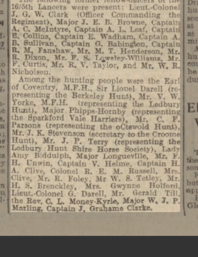 Lieut. Spence-Colby was thrown off, and another horse struck him on the head. His skull was fractured, and was immediately taken to Wincanton Hospital. A specialist was summoned from London, and it was hoped that despite his serious injury Lieut. Spence-Colby would recover. Yesterday morning, however, he took a turn “for the worse, and died at 6.45. The horse which he was riding, Patron Minet, has won several times the same meeting before. Spence-Colby was educated at Eton and Sandhurst. He joined the 16th/5th Lancers Tidworth in 1929. For two years he was stationed in Edinburgh, and later returned to Tidworth. He was devoted to horses, and riding both to hound: and at point-to-point meetings was his great delight. An exceptionally bold and brilliant horseman he had ridden with his father’s pack since he was a child. In point-to-point races he had been very successful, particularly with his own horse Bog Rat. He won his regimental race two years running and the Subalterns’ Cup. Racing Career Cut Short By his skill and judgment in the saddle he had also won several important other point-to-point races. His death, in the prime of his youth, has cut short most promising career soldier and horseman. Hunting people in many parts of the country will feel his loss keenly, but to none will the blow be great as to those in the Ledbury country, where he was loved and respected by countless friends and his parents, Colonel and Mrs. Spence-Colby, it the greatest tragedy they have known, and the sympathy of all Gloucestershire people will be extended to them ill their loss‘.