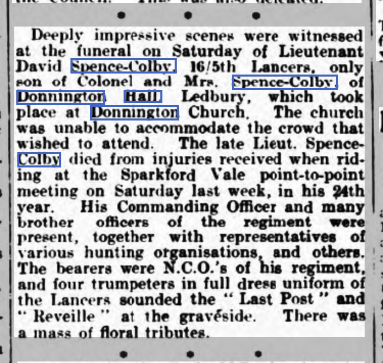 I also found this account in the archives of the actual accident reported in the Gloucester Citizen on Thursday 30 March 1933, reporting on the accident and Alfred’s death just the day before: DEATH OF LT. DAVID SPENCE-COLBY FATAL SEQUEL TO RACING ACCIDENT BRILLIANT HORSEMAN We deeply regret report the death which took place yesterday of Lieut. David Spence-Colby. of the 16th/5th Lancers, the only son of Colonel and Mrs. Spence-Colby, of Donnington Hall, Ledbury. Lieut. Spence-Colby, who would have been 24 in few day* time, met with accident while riding at the Sparkford Vale Harriers point- to-point meeting Babcary, Somerset, on Saturday. He was riding a horse named Patron Minet, and lying well about six fences from home when his horse pitched at a fence.
