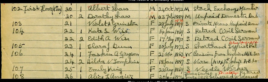 Then on 7 April 1909 Ralph marries Alice Louise Gaymer (1874-1956) at St Saviour, Ruskin Park, Southwark, London. In 1911 the couple are living at Oswald House, Bradwell, Derbyshire. Ralph is described as a Consulting Engineer. I have found no children of the couple. In the 1918 and 1919 electoral roll the couple were living at 100 Queens Ave, Finchley, London. By 1920/1 Alice was on her own living at 43 St. Luke’s Road. Paddington. He is living still in their home at 100 Queens Avenue, Finchley, London in the 1920’s and it wasn’t until the 1939 Register I found this that his wife had reported that he deserted her in 1919! So I wonder what happened? Alice in 1939 is living in a room on the first floor of a building in Marylebone, London. She reported: ‘Married. “Femme Seule” (Lone woman since 1919) Believed to be a widow. Retired Secretary.’ Alice is the last entry below: