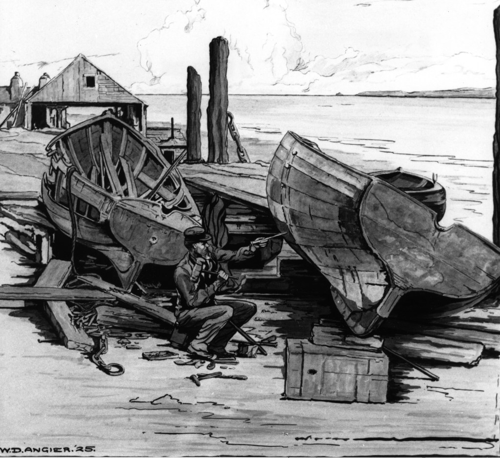 A note in the local paper records that he was specifically invited to show ten works at an exhibition of British Modern Artists at the Whitechapel Art Gallery in January 1929, whilst labels on his work show that he exhibited at the Panton Club in Leicester Square. When his work was included in an exhibition of the Thames Valley Arts Club in 1928, The Surrey Comet commented, “Some of the cleverest work to be seen is contained in the contributions of Mr W.D.Angier, who favours what may be termed the poster style for his landscapes and makes use of almost geometrically precise patterns of brilliant colour to achieve his excellently decorative effects.” I also attach a painting Thaw Time near Lake St John, which was originally part of the collection in The Sloop Inn, St Ives. This might bea Canadian scene, evidencing that he had started painting over there. I am a particular fan of Angier’s work and have the three attached examples – In St Ives Harbour, Old Timers Going Out and Matt Cocking’s Corner, which always draw comment when people come to the house. It is a most distinctive style, with areas of flat colour, surrounded by bold lines‘. This is David’s Website if you want to know more about his work: https://www.stivesart.info/ Here are the Art Works of Walter Donald Angier he shared with me. L to R top row. 1.Old Timers setting out. 2.By Angier, no title.3. The Boat Builder.