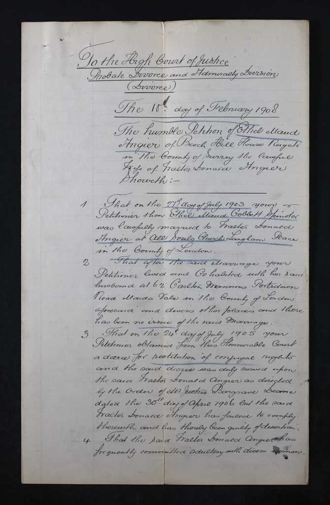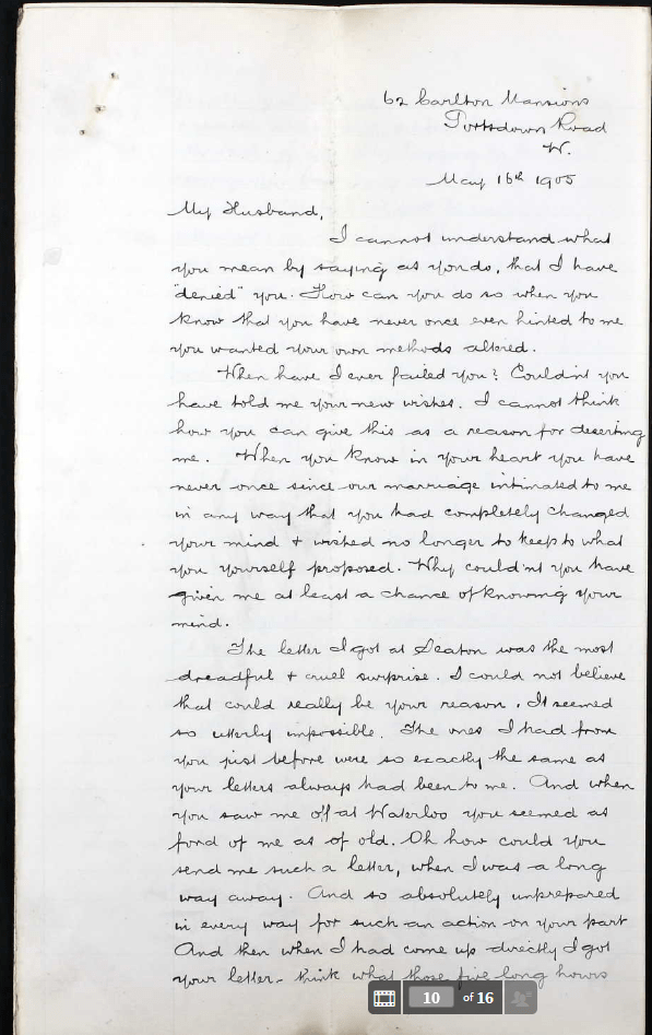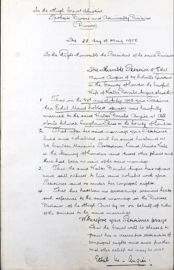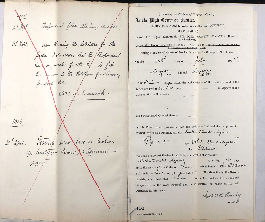 On the Divorce papers the ‘Setting down ‘ was on 7 June 1905 and ‘Decree’ dated 24 July 1905. His wife Ethel was after him, she wanted him to return to her (letter explains more, further down) applying for an order for him to return to her and to give her her conjugal rights back! The Divorce papers make really interesting reading: