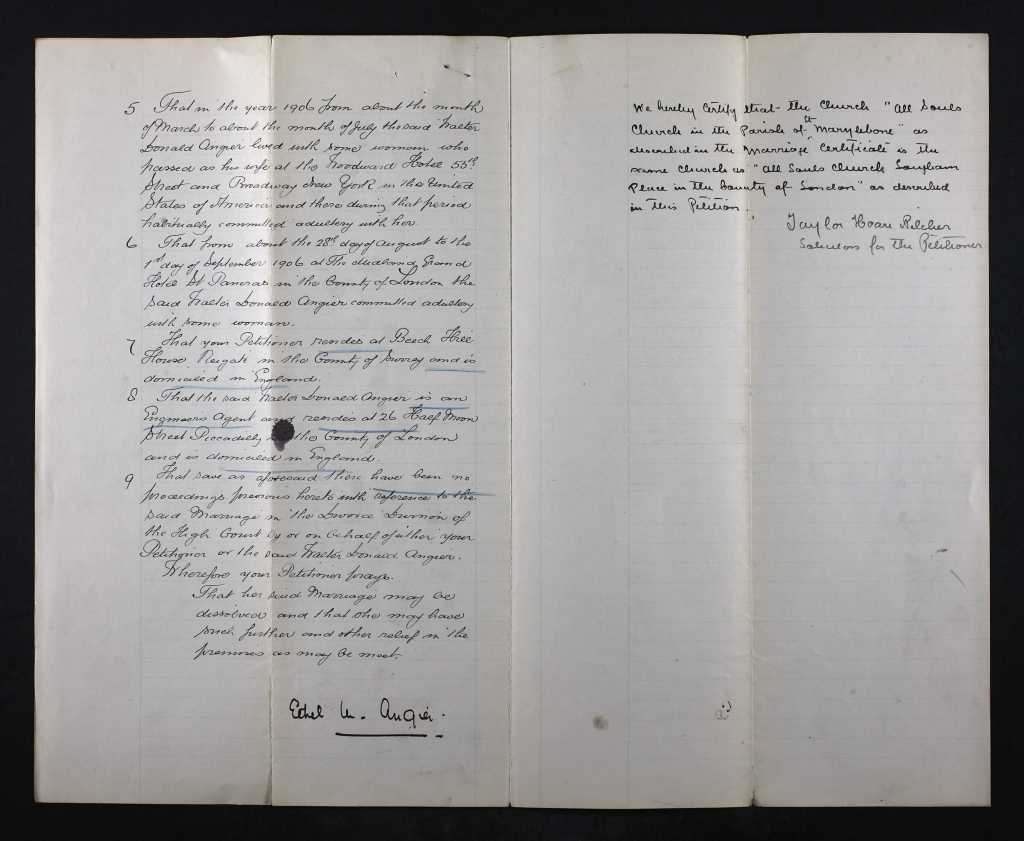 27 Jul 1903. Marriage to Ethel Maud Cobbett at All Souls Church, St Marylebone, London. He is described as a Gentleman. His father Athelston Alfred Angier (deceased) Shipping Owner. Walter giving his address as Langham Chambers.