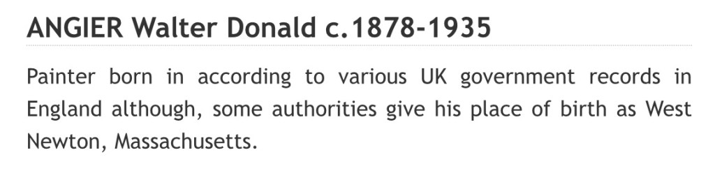 So the dilemma I have now is…….is that death record of Walter Donald (Adrian) Angier the Artist the death record of my Walter Donald Angier are they one and the same person? I have followed up on so many records and links to try and confirm or deny whether these two gentlemen match I feel totally fuddled! The first record I can find about Artist Walter this reference to him being in Cornwall in 1931 on Find My Past, then mentioned in that Newspaper report on his death in 1935 as arriving at that particular location in 1933 (that we now know was 1931) as an Artist. No records on the Artist Walter before this date here in UK or in America. Looking up what different sites have said about Walter the Artist they say he was born in 1878 likely in America, one site said he retained his American citizenship when he came to the UK. Another record has another Walter Donald Angier an Artist b1900-d1972, have found nothing at all to confirm this man either in any records, unless someone used this name as an alias. The works of art on the internet all seem to have just the one name attached Walter Donald Angier (no Adrian) Another source says he was part of the Angier Chemical/Pharmaceutical Company. Looking at the family of that company there is no match at all. The President of the company did have a son called Donald but different birth date etc etc, no connection.