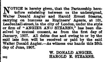 Continuing Walter’s Timeline on 2 March 1906 he arrived back in New York but this time he had a lady travelling with him, an Evelyn May Angier? Described as his wife! No! it was not! and I have found no record of the lady at all. Same initials as his wife Ethel Maud but a ruse. Very naughty! In 1907 he was still living at 62 Carlton Mansions, Paddington North and then in the summer of 1907, reported in the London Gazette on 2 Jul 1907 that he split with his business partner, they were Engineer’s Agents.