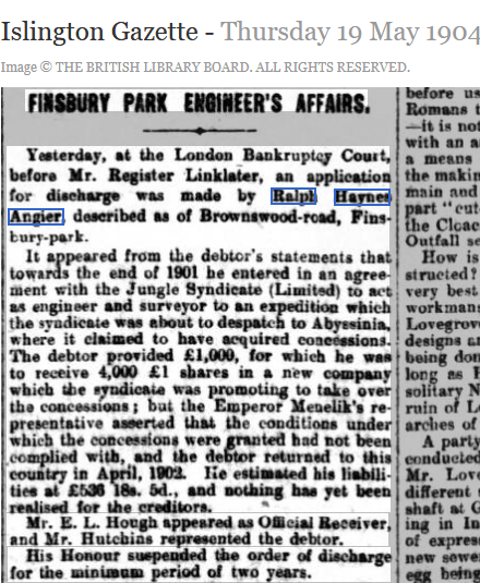Ralph in the 1881 census, aged 16 and was a Boarder at the “Grammar School” Preist End, Thame in Oxfordshire. Then the next I found of him was a court report in 1903 that his occupation was a Mining Engineer and he applied to get his money back, he lost it on appeal and it seems it made him Bankrupt. But only for a few months as he applied for a discharge: