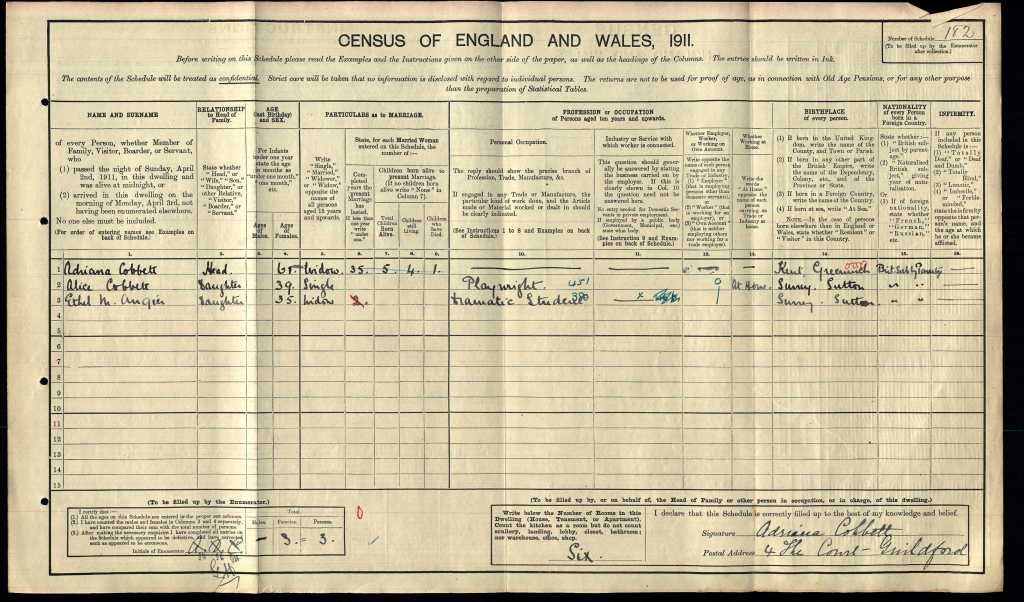 So back to 1911 and his ex wife Ethel in the 1911 census describes herself as a Widow (more respectable than a Divorcee) and a Dramatics Student. I wonder if she made a success of the acting? She is living with her widowed Mum and sister Alice Cobbett who was single and described as a Playwright. See below. Although I haven’t found any plays she wrote I have found she edited and published some of her fathers work and also published her own work.