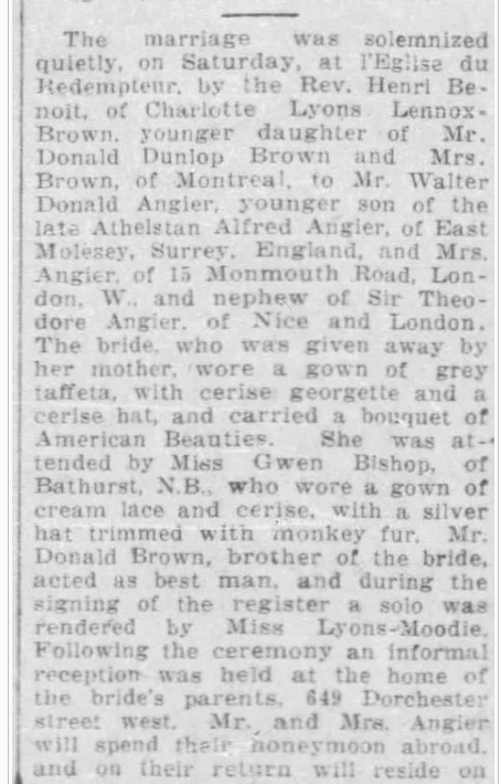The next record I found of Walter is on the passenger list for July 1923 arriving back in Southampton coming from Quebec, Canada. Proposed address was given as 15 Monmouth Road, Bayswater, London. He was travelling 3rd Class and is described as a Merchant. Aged 49 and Canada was listed as his last permanent residence now to be England. He was not travelling with anyone. So had he just visited Canada for business or did he live there for a few years? I had to know….so I just put in Walter Donald Angier and Canada in the Search Box and wow I came up trumps! Notice of a marriage on Newspapers.com on Ancestry! As I haven’t got a subscription to that, I quickly registered for a FREE 7 Day trial. So pleased I did as there were 2 articles: