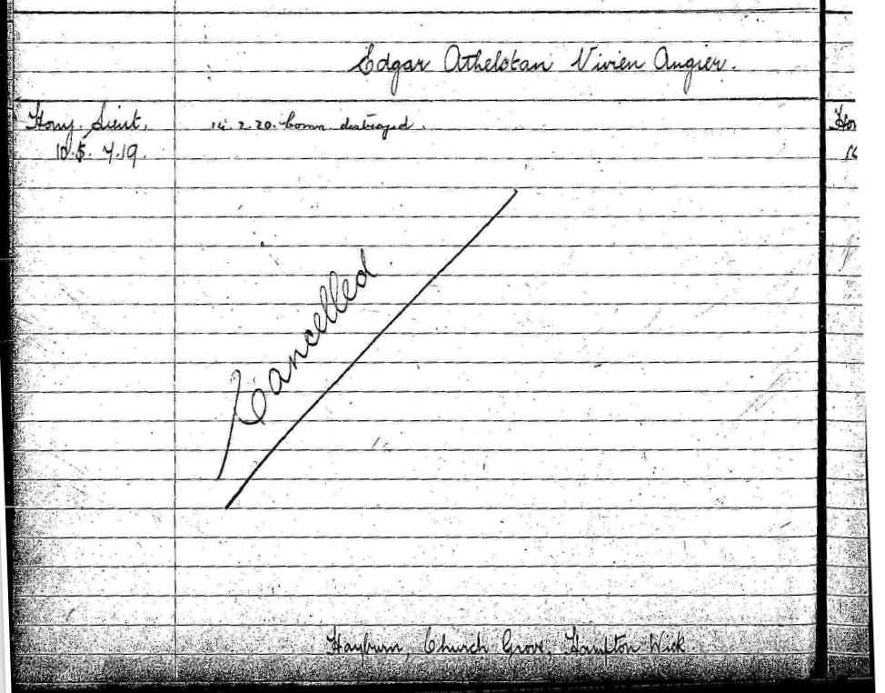 Edgar Athelston Vivien Angier was also the person in the family to deposit the records of the ‘Fifty years freights, compiled by E.A.V. Angier, 1869-1919‘. Relating to the Angier shipping companies. These are in the Royal Museum at Greenwich. There are also many records at the National Archives of the Angier Shipping Companies. In the 1939 Register Edgar was a A Chartered Ship Broker. He was still with his wife Mary who is described as working at a First Aid Dressing Station. They lived in Twickenham. Mary died on 2 Jan 1977 at 15 Spencer Rd, East Molesey, Surrey.
