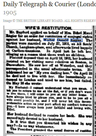 27 Jul 1903. Marriage to Ethel Maud Cobbett at All Souls Church, St Marylebone, London. He is described as a Gentleman. His father Athelston Alfred Angier (deceased) Shipping Owner. Walter giving his address as Langham Chambers.