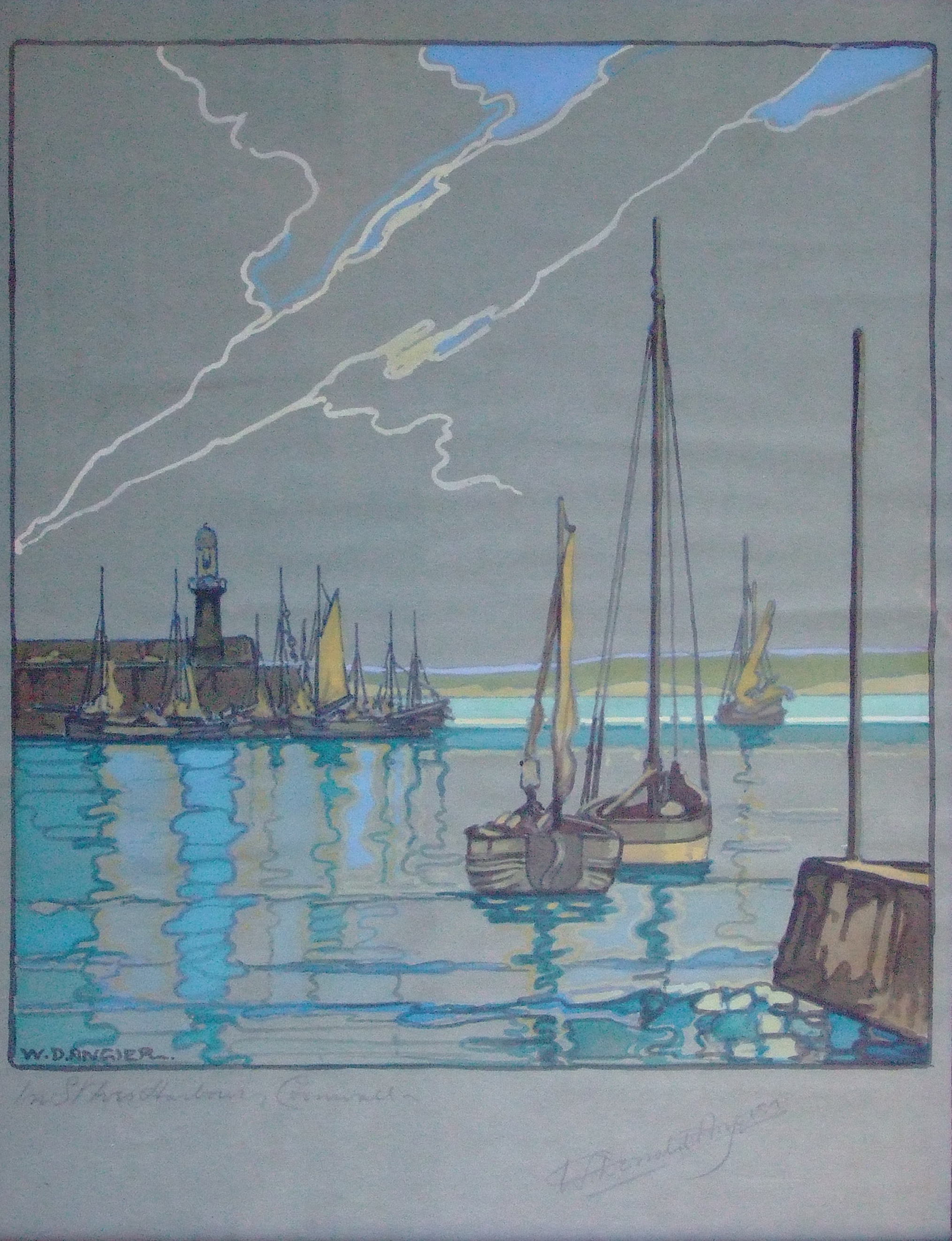 He joined the St Ives Society of Artists in 1928 – it was set up in 1927 – and remained a member until 1932. In 1928, when the Society arrangedto have its own Gallery at 5 Porthmeor Studios, it was a design by Angier