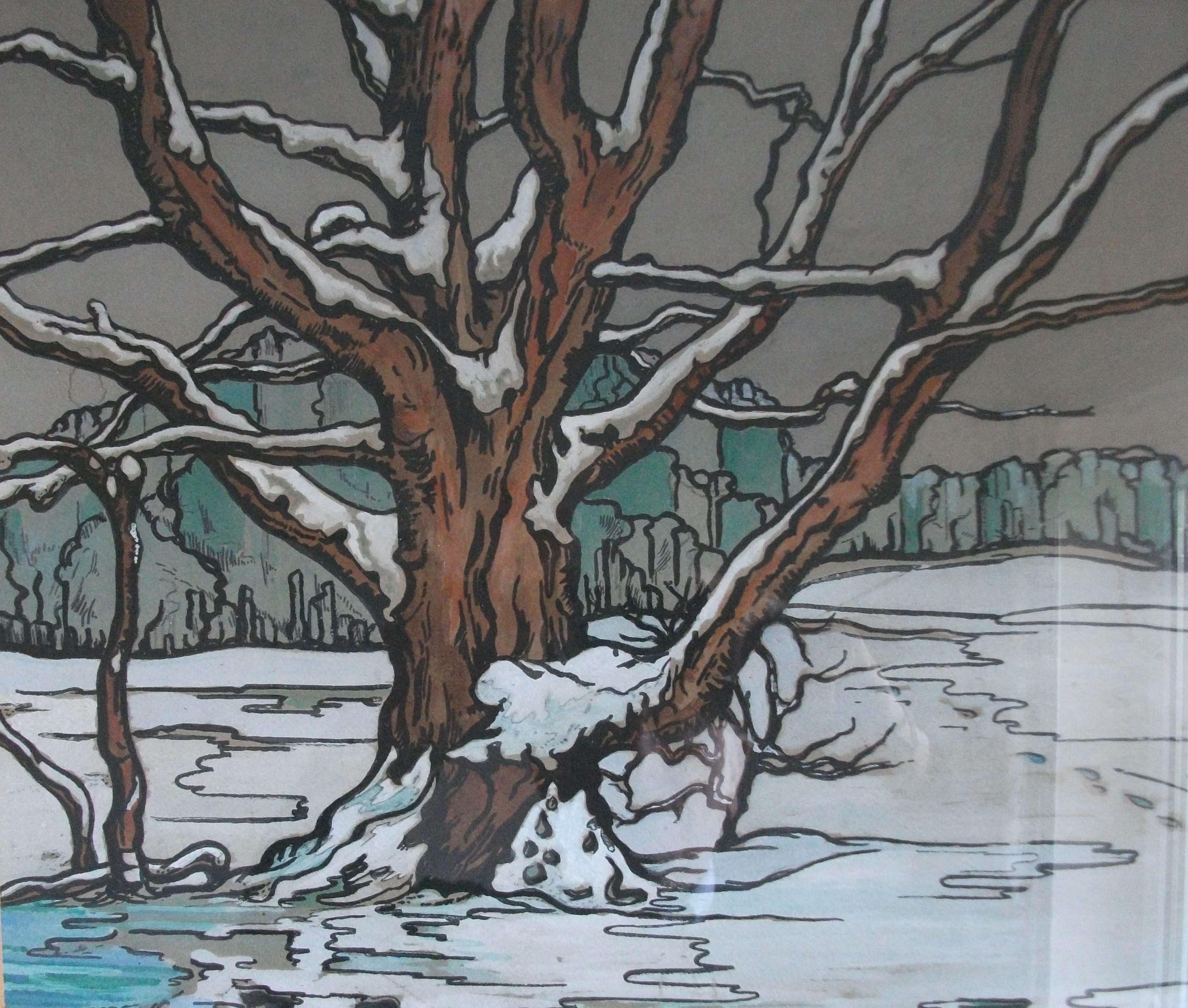 A note in the local paper records that he was specifically invited to show ten works at an exhibition of British Modern Artists at the Whitechapel Art Gallery in January 1929, whilst labels on his work show that he exhibited at the Panton Club in Leicester Square. When his work was included in an exhibition of the Thames Valley Arts Club in 1928, The Surrey Comet commented, “Some of the cleverest work to be seen is contained in the contributions of Mr W.D.Angier, who favours what may be termed the poster style for his landscapes and makes use of almost geometrically precise patterns of brilliant colour to achieve his excellently decorative effects.” I also attach a painting Thaw Time near Lake St John, which was originally part of the collection in The Sloop Inn, St Ives. This might bea Canadian scene, evidencing that he had started painting over there. I am a particular fan of Angier’s work and have the three attached examples – In St Ives Harbour, Old Timers Going Out and Matt Cocking’s Corner, which always draw comment when people come to the house. It is a most distinctive style, with areas of flat colour, surrounded by bold lines‘. This is David’s Website if you want to know more about his work: https://www.stivesart.info/ Here are the Art Works of Walter Donald Angier he shared with me. L to R top row. 1.Old Timers setting out. 2.By Angier, no title.3. The Boat Builder.