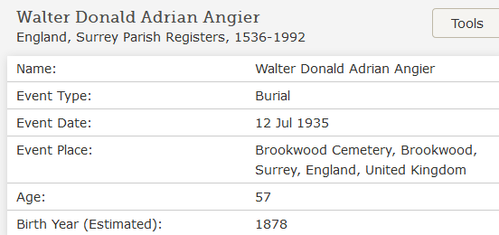 So after searching all possible sites I can’t find any other births in America or in the UK of another Walter Donald (Adrian) Angier at all. I do have the details of the registration and baptism of my Walter. But I cannot find another death record in that name. Definitely no births anywhere with Adrian as a middle name. Plus the very strange thing is that although this Artist Walter died in Cornwall he was buried in Brookwood Cemetery, Brookwood in Surrey. Now isn’t that puzzling? Did another family member bring him back to Surrey after his death? So basically no record of Artist Walter before 1931 and no record of my Walter after 1930, just too much of a coincidence isn’t it. This then is the same man, who decided he wanted to live a peaceful simple life in Cornwall after all the turmoil and excitement. What do you think? Am I right?….. Oh yes I am! Yay!…..I kept searching and decided to go back to Family Search where I had found his record of burial and look through for any other Angier family burials at Brookwood Cemetery and yes! they were all there, his Mum Henrietta Blanche Angier buried 18 Nov 1930, His Father Athelstan Alfred Angier buried 3 Dec 1892, his uncle Sir Theodore Vivian Samuel Angier buried 13 April 1935, Linda Beresford Angier, Sir Theodore’s first wife buried 4 September 1890. Still don’t know where the Adrian came from, but we can’t win them all.