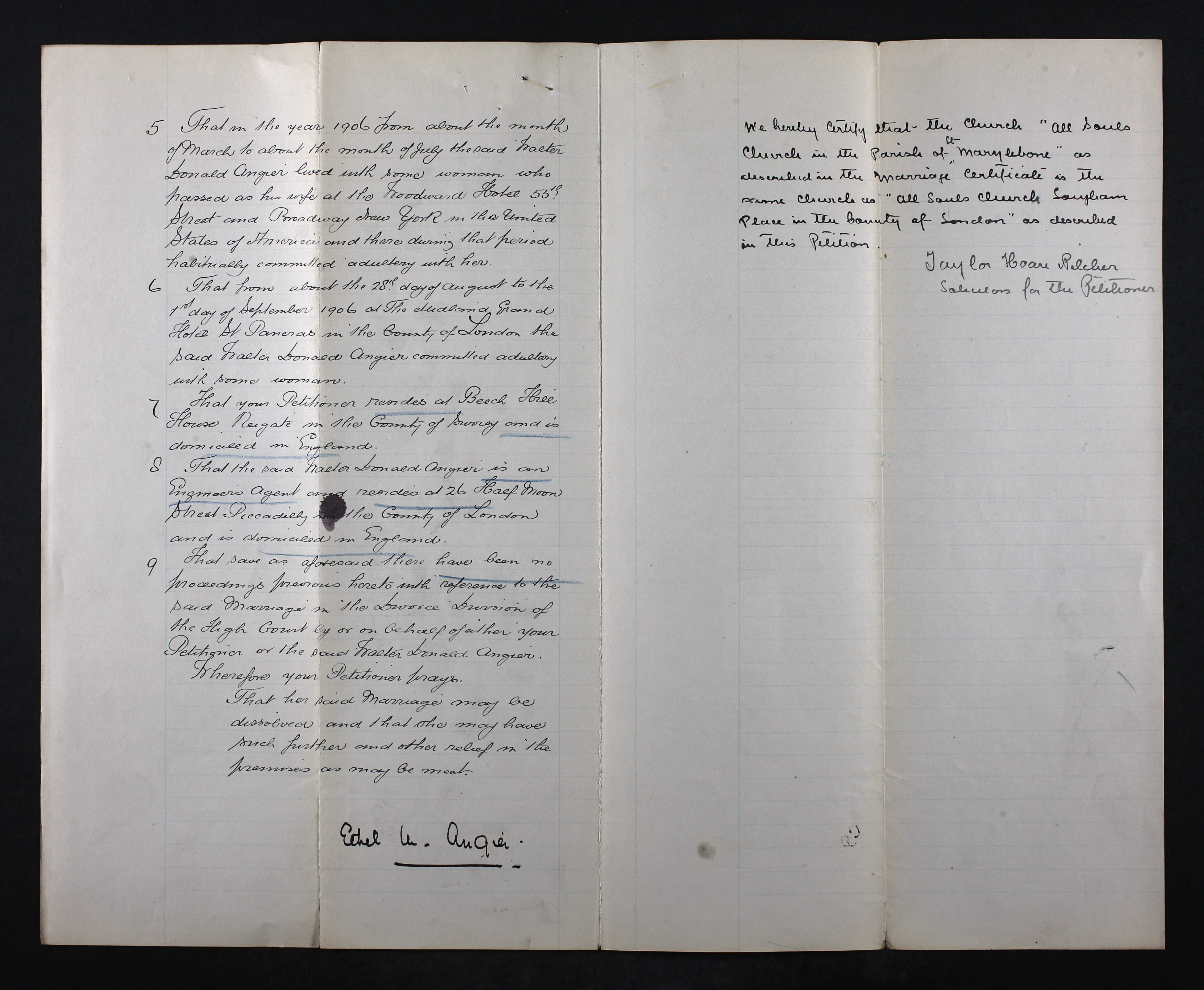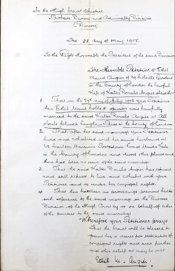 On the Divorce papers the ‘Setting down ‘ was on 7 June 1905 and ‘Decree’ dated 24 July 1905. His wife Ethel was after him, she wanted him to return to her (letter explains more, further down) applying for an order for him to return to her and to give her her conjugal rights back! The Divorce papers make really interesting reading: