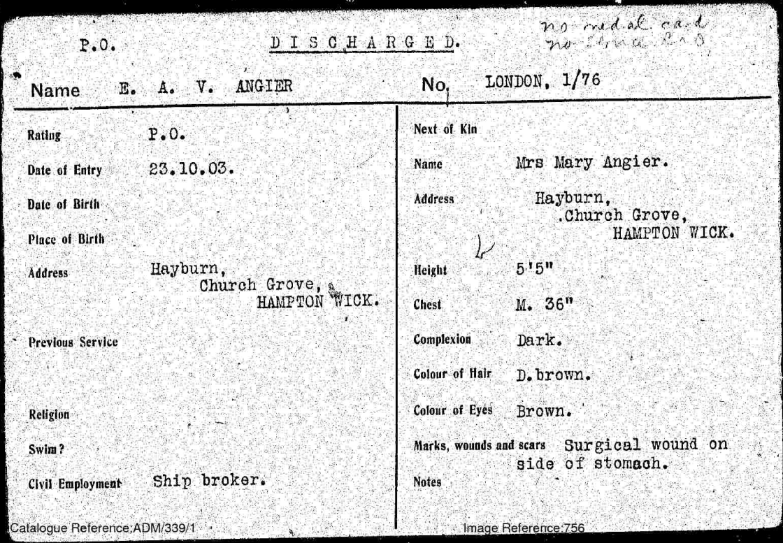 Walter’s brother Edgar Athelston Vivien Angier has an entry in the volunteer Royal Navy Reserves found on National Archives. Also an entry for his previous service, 2 pages, where he was a Petty Officer.