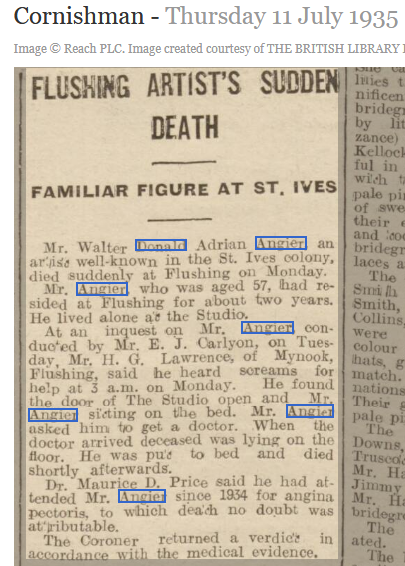 So the dilemma I have now is…….is that death record of Walter Donald (Adrian) Angier the Artist the death record of my Walter Donald Angier are they one and the same person? I have followed up on so many records and links to try and confirm or deny whether these two gentlemen match I feel totally fuddled! The first record I can find about Artist Walter this reference to him being in Cornwall in 1931 on Find My Past, then mentioned in that Newspaper report on his death in 1935 as arriving at that particular location in 1933 (that we now know was 1931) as an Artist. No records on the Artist Walter before this date here in UK or in America. Looking up what different sites have said about Walter the Artist they say he was born in 1878 likely in America, one site said he retained his American citizenship when he came to the UK. Another record has another Walter Donald Angier an Artist b1900-d1972, have found nothing at all to confirm this man either in any records, unless someone used this name as an alias. The works of art on the internet all seem to have just the one name attached Walter Donald Angier (no Adrian) Another source says he was part of the Angier Chemical/Pharmaceutical Company. Looking at the family of that company there is no match at all. The President of the company did have a son called Donald but different birth date etc etc, no connection.
