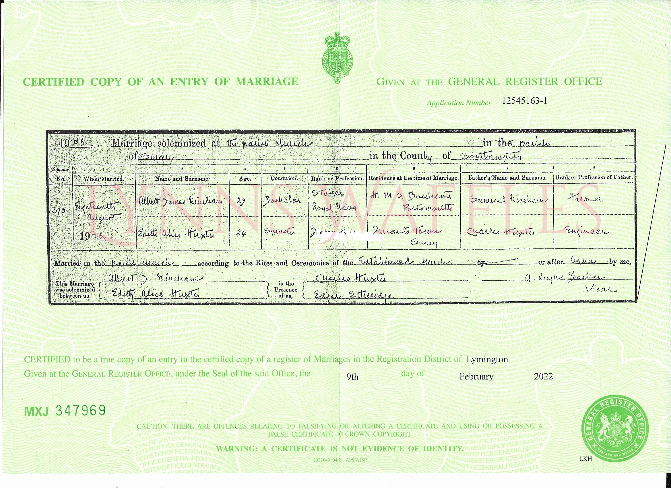 💕Albert James Nineham married Edith Huxter in Lymington, Hampshire💕