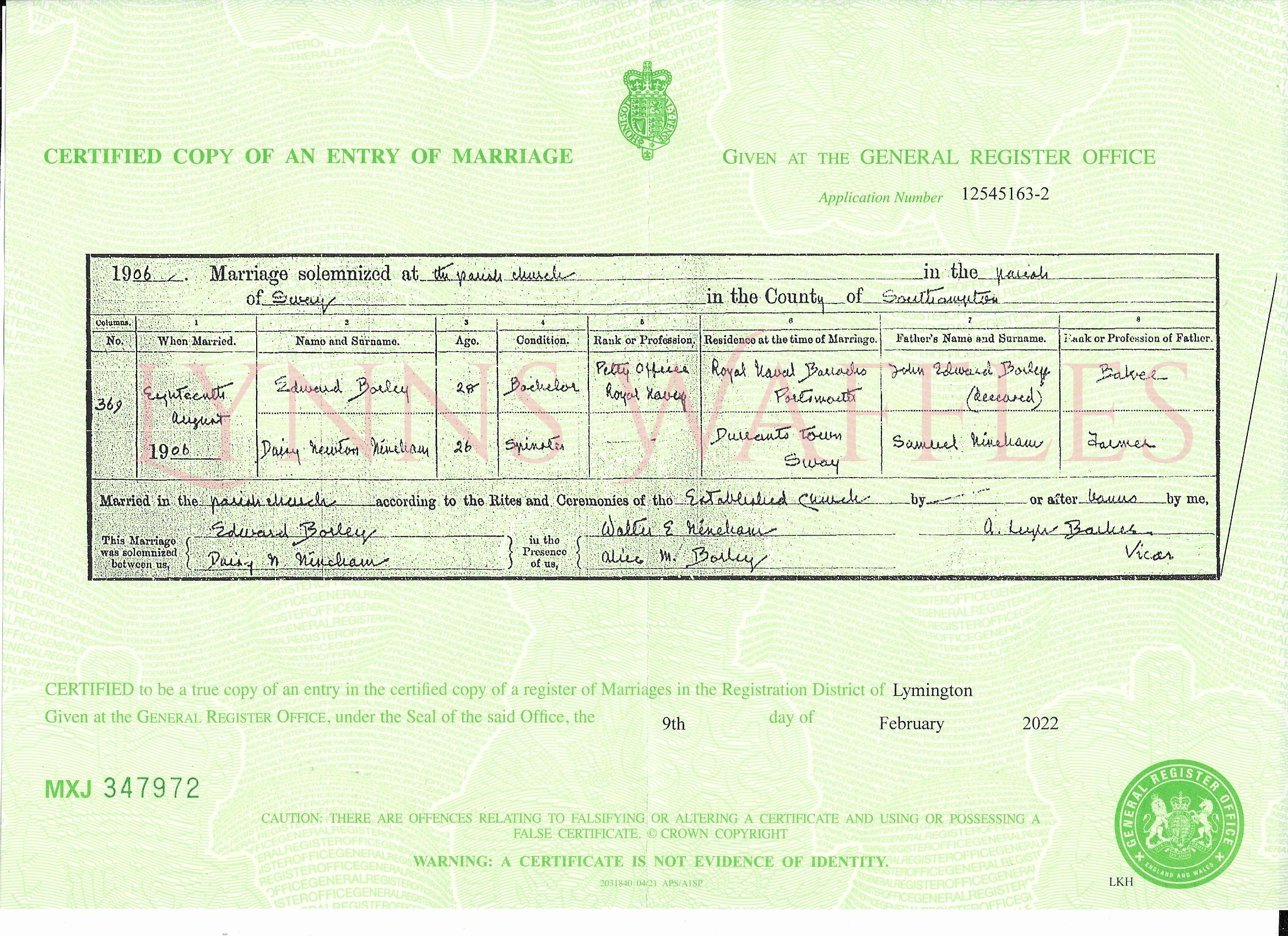 So I likely had 2 of the couples, Samuel and Ann Nineham’s son and daughter identified, but who was the third couple? Were they cousins, that would surely be the most likely? But I had an idea to look at the records of the two I had found and the reference for them both which was Lymington, Hampshire Vol 2b Page 1469. So I thought it was likely that the other couple would be either on the same page or the page before or after. So I looked at all Weddings for 1906 in Lymington, 201 possibilities, 100 couples. Not too bad I’ve had longer list’s to search through.