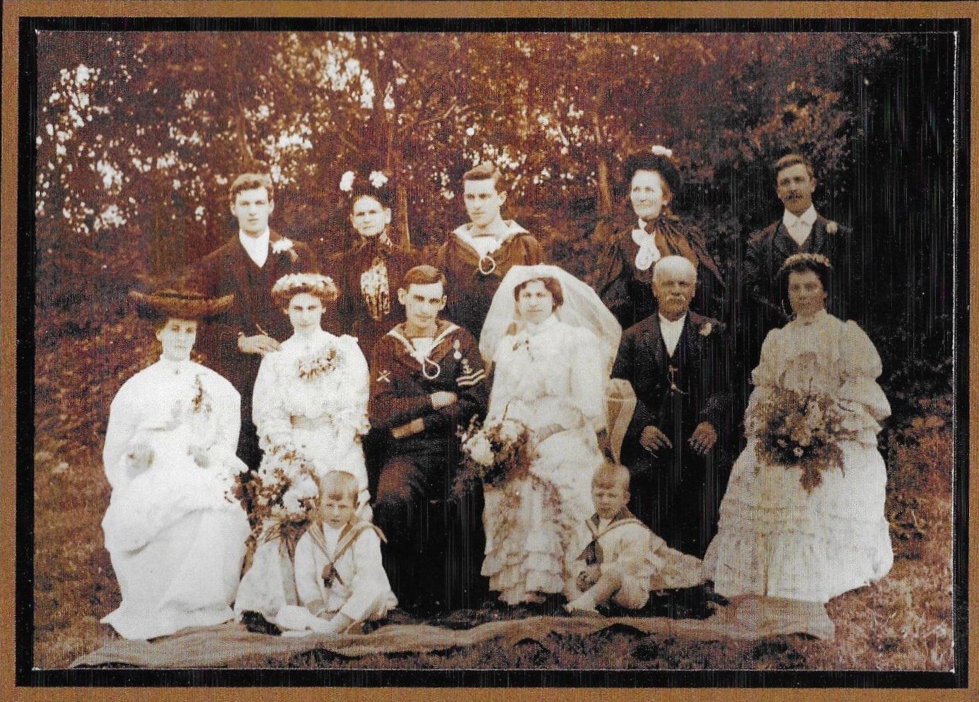 Fabulous photo isn’t it! The three couples are quite clear with each of the grooms wearing military uniforms, one Army and two Navy. That would definitely help me to identify them I hope.
