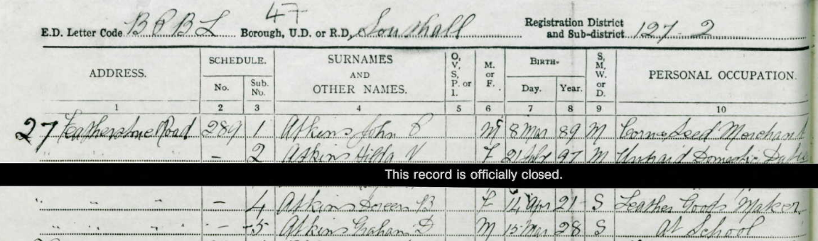 As you can see they both live at the same address in Acton at the time of their marriage so only about ten miles from the address where they sent the postcard from. Then in the 1939 Register, they lived at 27 Featherstone Road, Southall, Middlesex. John was now a Corn and Seed Merchant, so presumably, the family lived above the shop.