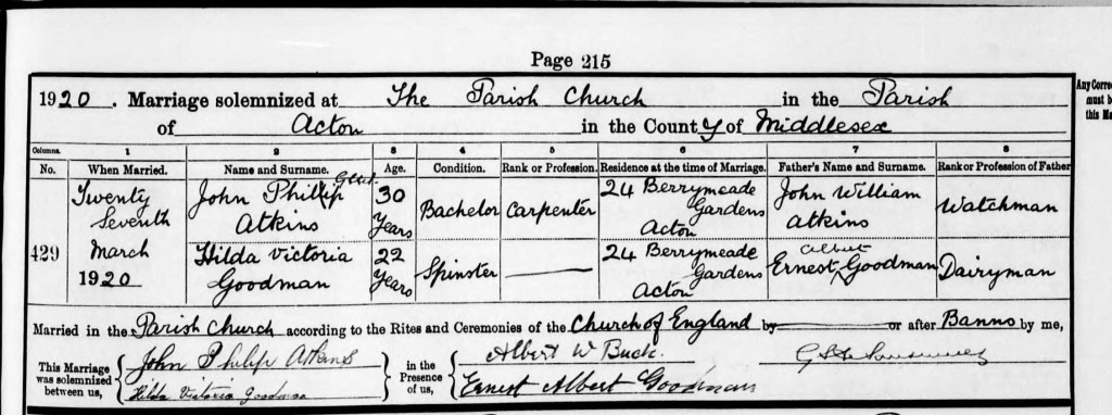 Hilda Victoria Goodman married John Philip Atkins on 27 March 1920.