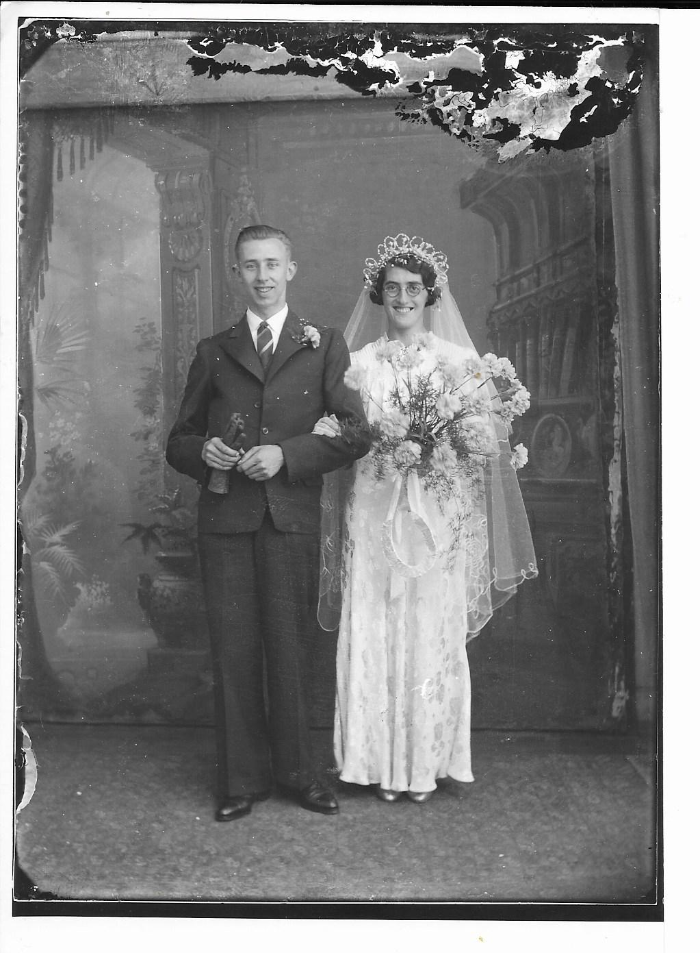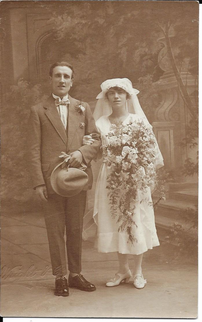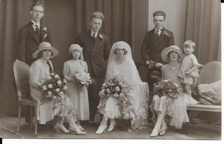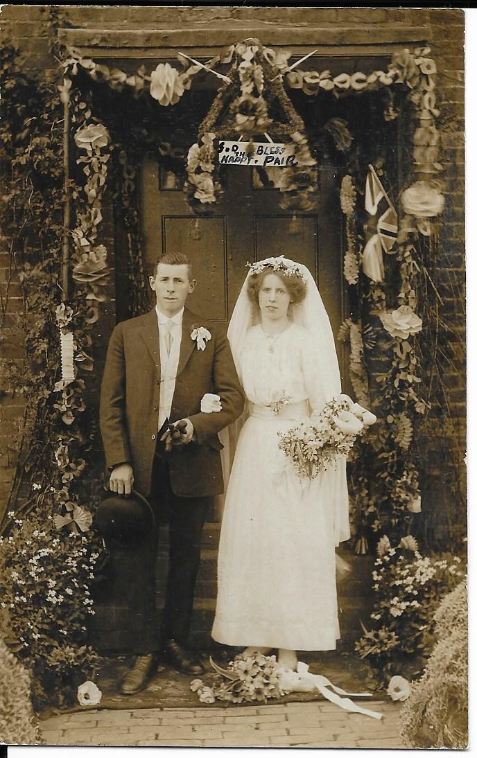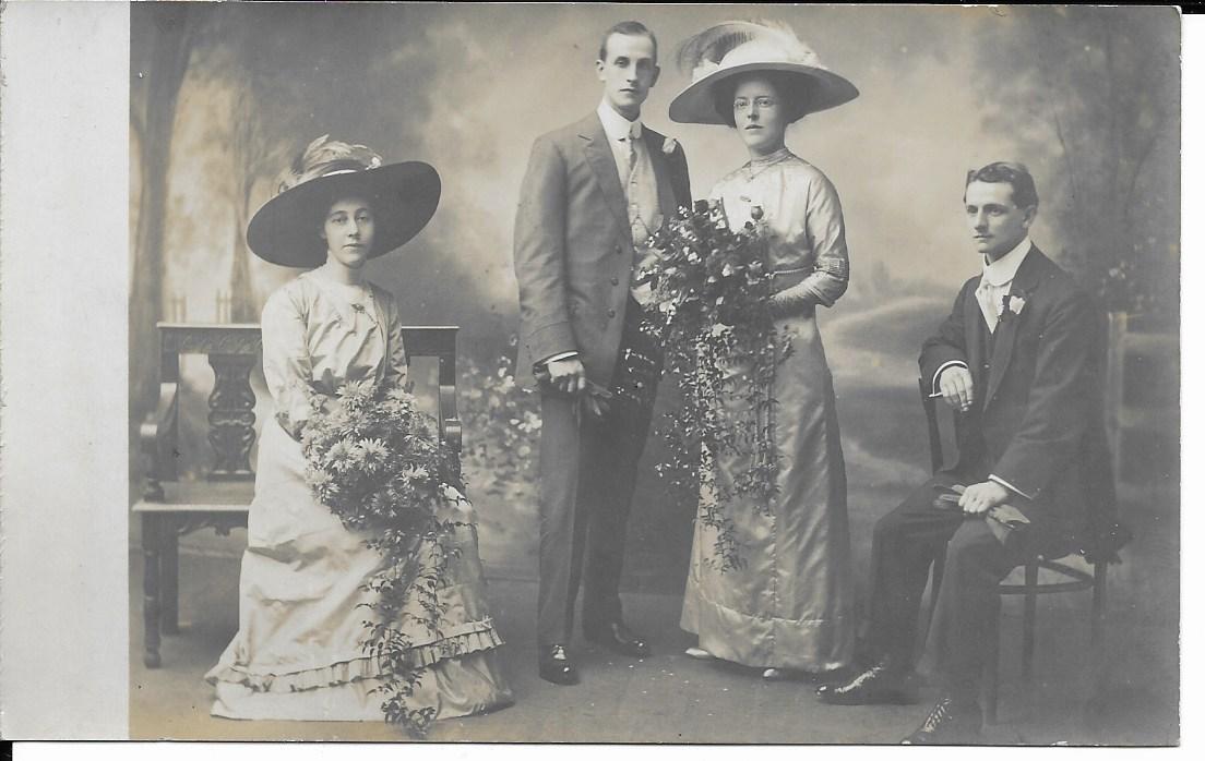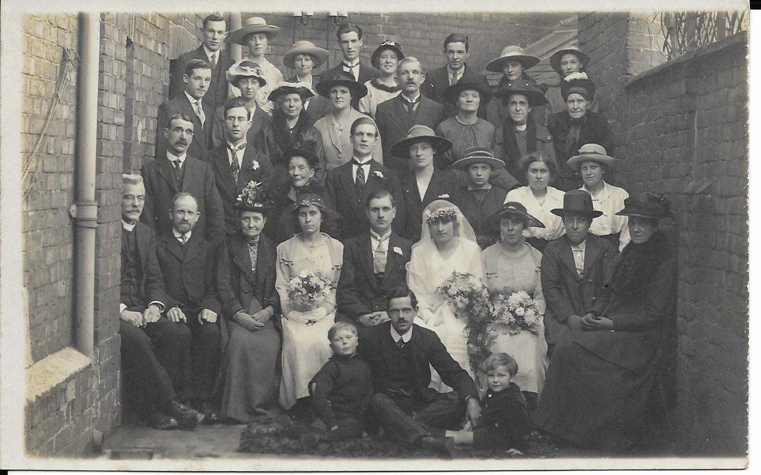 Although I collect a wide range of old photos with people featured, I have a special fondness for Wedding Photos and now have over a thousand. They are very varied from small square little photos from the 1940s/50s to very large Victorian card framed photos of huge groups of people wearing spectacular outfits, especially hats. A small number do have writing but the majority are unnamed.