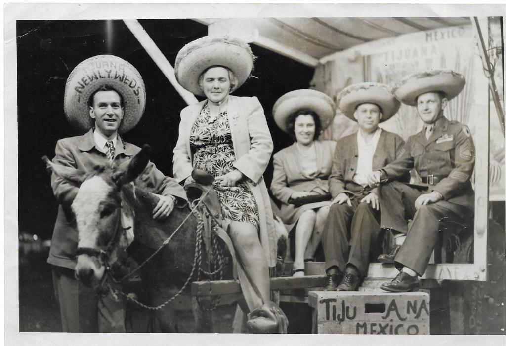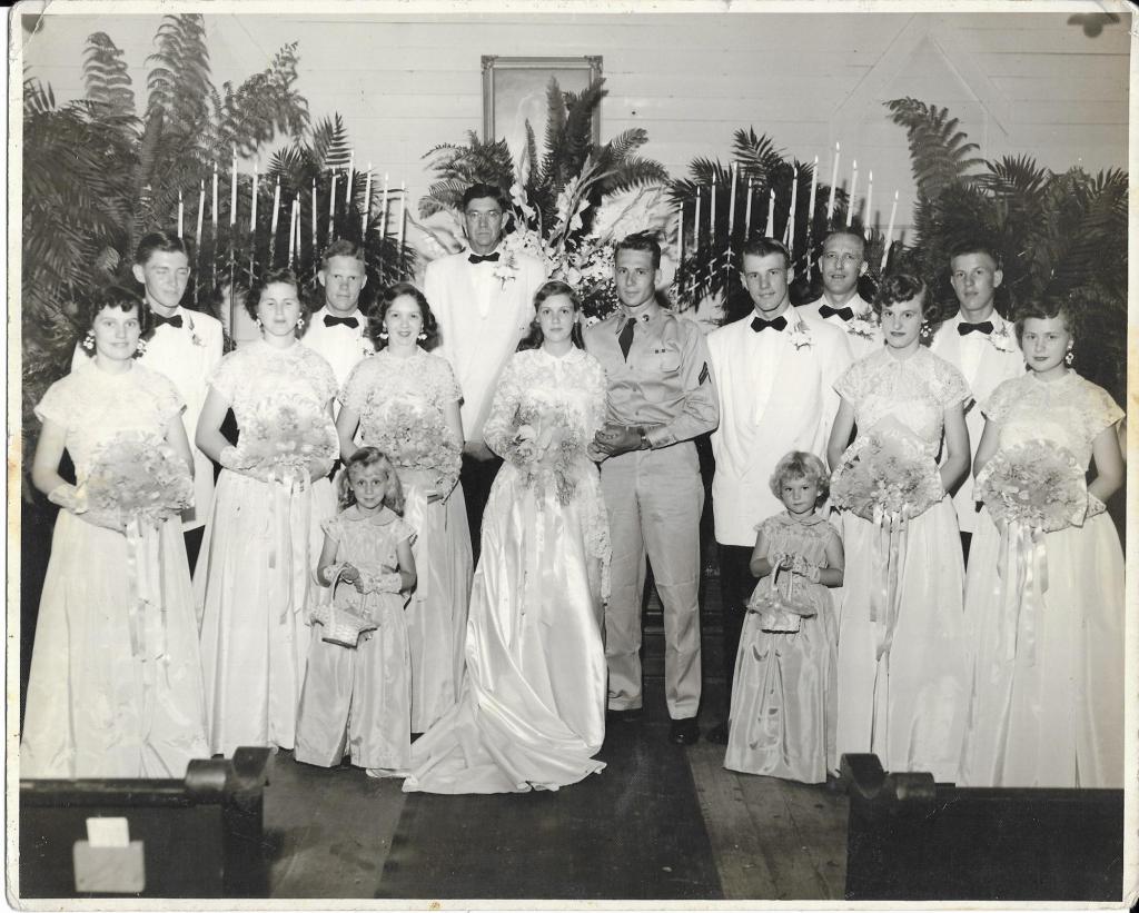 This large group photo above is very much American. The groom’s uniform reminds me very much of the photos of Elvis Presley in his American Army uniform from the late 1950s. Written in the book it says: ‘This service wedding is being witnessed somewhat disapprovingly by the bride’s stern father in the back row. With ten bridesmaids and groomsmen, two flower girls, and a jungle of floral and palm frond arrangements, this father may be working out just how much the wedding is costing him‘.