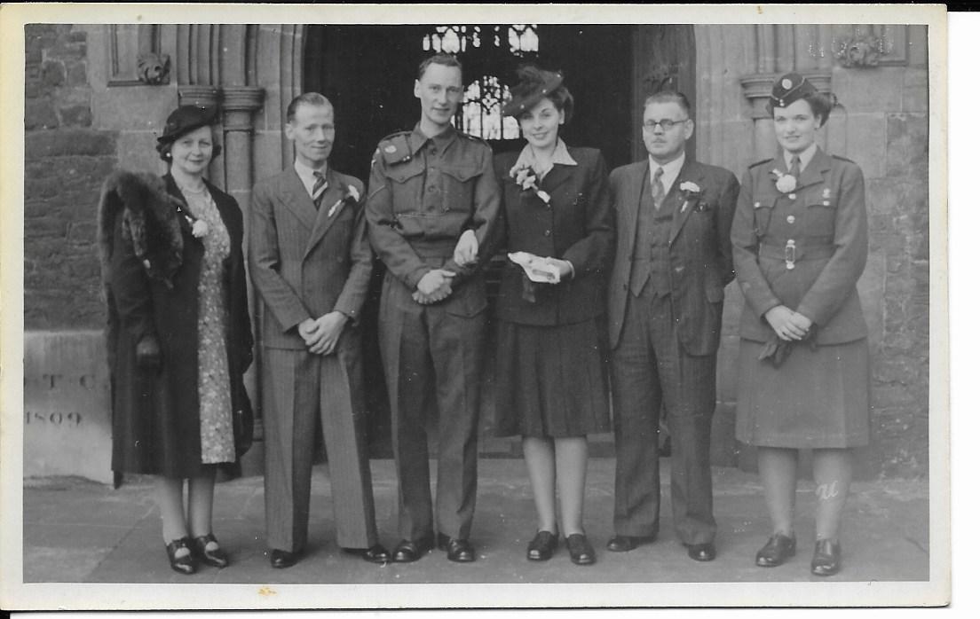Written: ‘This picture above underlines the reality of the wartime wedding. The groom and the bridesmaid wear battle dress, and the bride makes do with a plain two piece and a jaunty hat. But they all look pretty cheerful. Best dressed is the couple on the left, he is in a natty suit, she in her fox fur’.