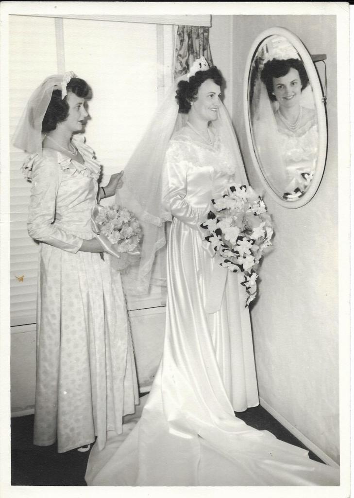 These next three photos, left to right, above. 1) It is Southern Rhodesia in the 1950s, when it was under British rule, and a stylish colonial wedding is taking place in Bulawayo. There is no hint of any African influence in this photograph, the couple dancing their first waltz (written on the back of the photo) at their reception could be anywhere in the world. 2) 1930s. It was a Royal bride, Princess Marina, who in 1934 first popularized the diadem as fashionable bridal wear. It is worn to full effect here by this beaming nymphet, who clutches her lucky horseshoe. This diadem is probably made from decorated wire rather than diamonds and pearls though. 3) 1950s. Carefully posed photo with the bride, glamorous in a satin gown with a long train, meeting the viewer’s gaze only through her reflected image. Here we are allowed to witness the behind-the-scenes final adjustments to the veil by the chief bridesmaid who, unusually, is sporting a mini veil herself. This one has an American look I’m thinking?