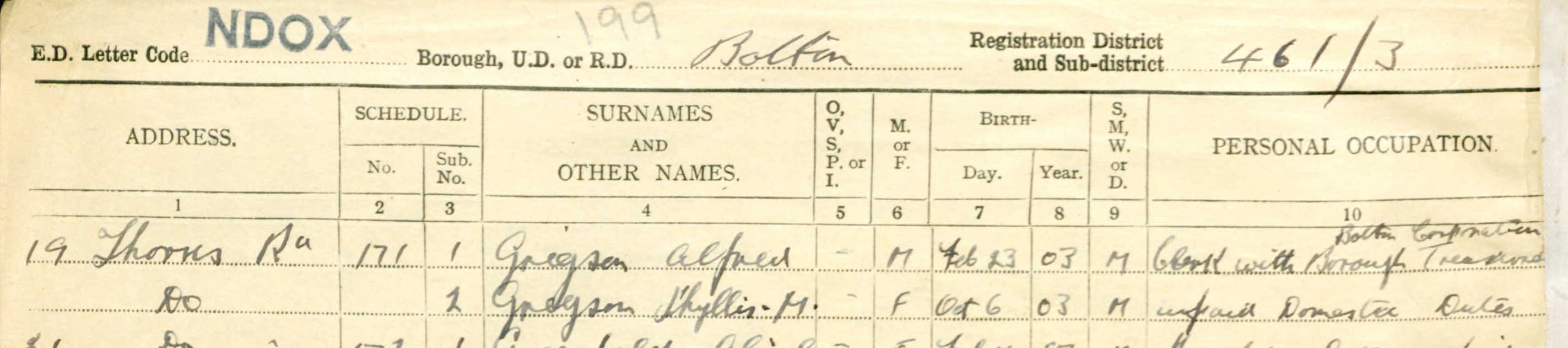 Alfred Gregson was born in 1901 (Although it says 1903 on the 1939 register, this doesn’t match with the records I’ve found) in Bolton, Lancashire, his father was Richard 1855-1924 and his mother was Janet Kershaw 1872-1926, it was a second marriage for them both when they wed in 1899. Alfred had many siblings and also half siblings from his parent’s first marriages, a few of them were Cotton Weavers according to the census records. Alfred died in October 1963 in the Blackpool area of Lancashire, at the age of 62.