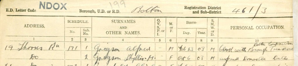 I was thrilled to find that someone has written on the back of this beautiful wedding photo above. The happy couple is Phyllis (Howarth) and Alfred Gregson, Bolton. So of course I had to research them just a little! They married in the first quarter of 1930, registered in Bolton, Lancashire. Here is the couple on the 1939 register, Alfred is a Clerk working for the Bolton Corporation. The couple is shown at the top of the page living at 19 Thorns Road, Bolton, no children at the address and I haven’t found any born to the couple.