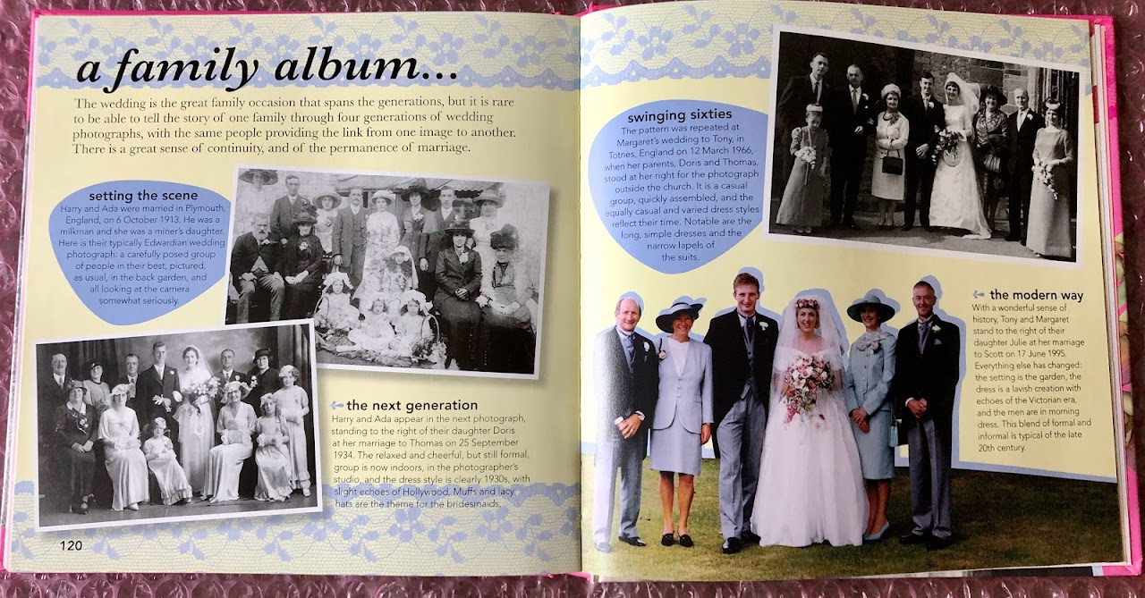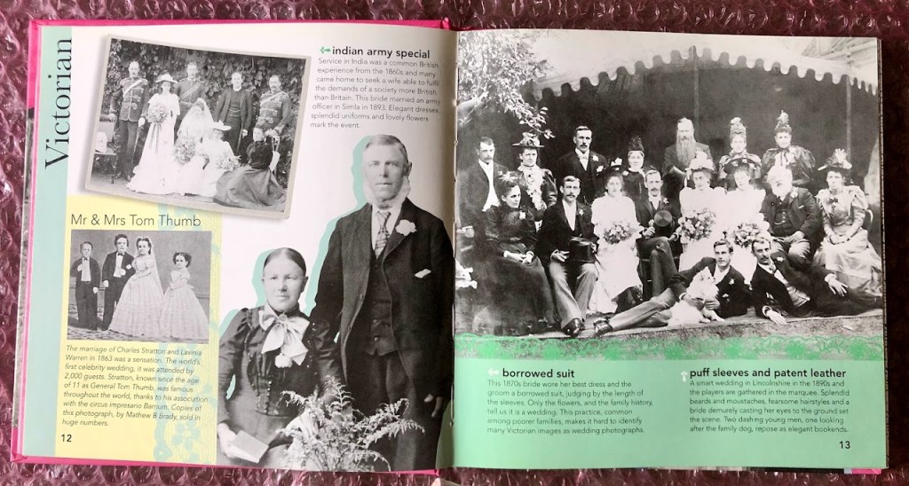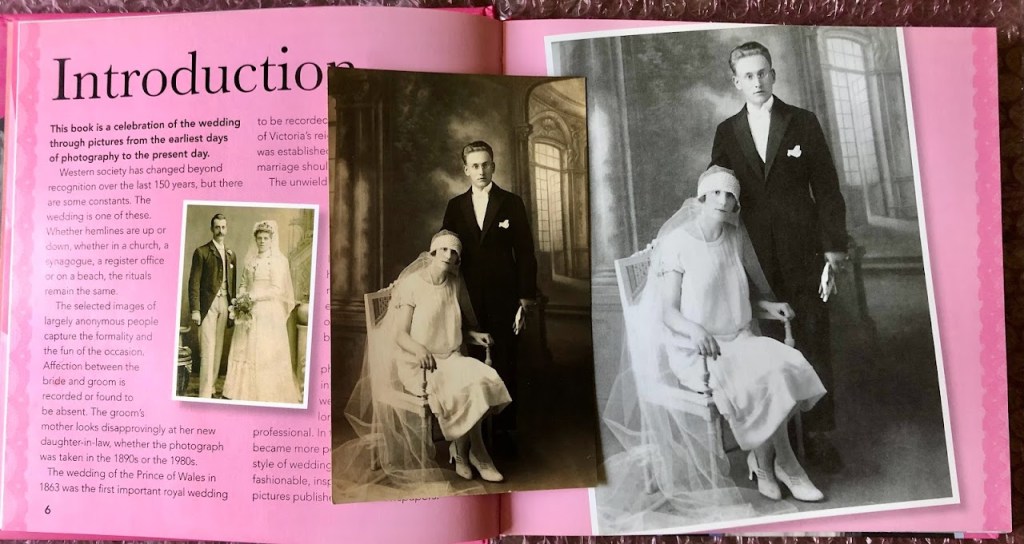 The accompanying writing with these four photos below in the book says 1) ‘Edwardian. The bride is dressed fashionably in a tailored suit and the groom in a lounge suit showing that he is either a working or middle-class man. Both have tight hold of their gloves, expensive accessories for their special day‘. 2) ‘Wedding in Wartime‘ 3) ‘Edwardian. Photographer from Walsall. Evidence that this is a well-healed wedding can be seen in the bride’s elaborate bouquet and embroidered gown and in the groom’s top hat and frock coat. Gradually frock coats were superseded and by 1920 the morning coat was established as formal dress for monied gents‘. 4) ‘1920s. The groom may have perhaps borrowed his suit from a shorter man, but his hat shows up to the minute fashion sense. Soft felt hats became popular for men in the 1920s. The trilby, which symbolized democracy and equality at this time, was often worn by men who moved in artistic or intellectual circles‘.