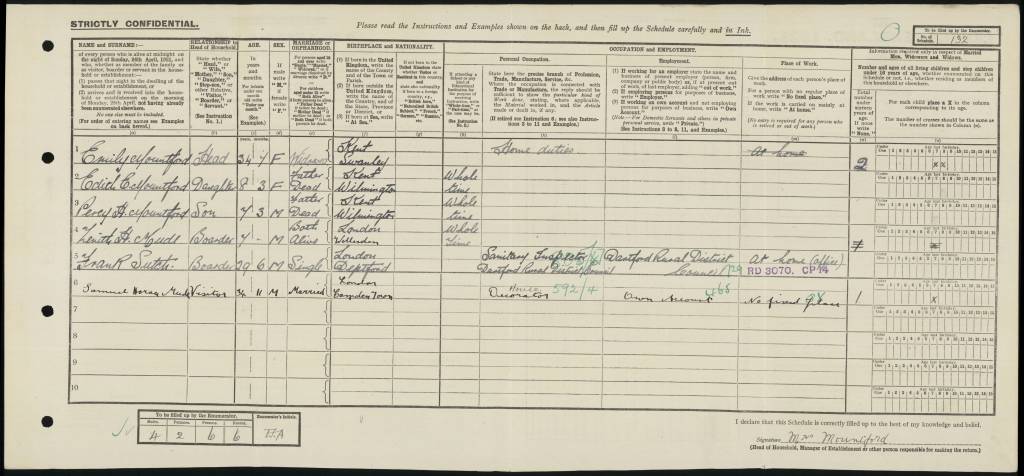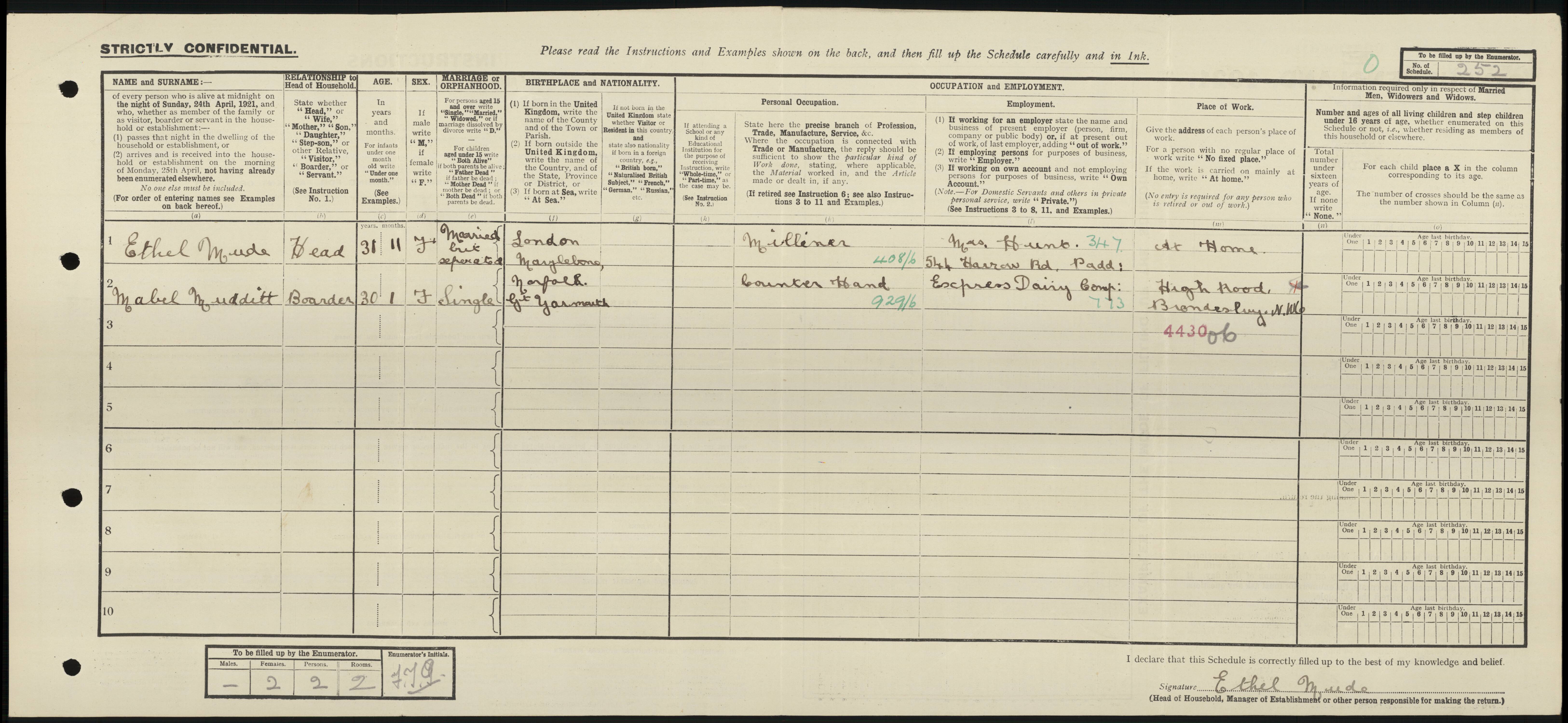 After a while I couldn’t help myself I had to know, so I paid up to view the original image and I’m so very glad I did, if you look below you will see she had written on the record that she was married and separated! Something that Samuel hadn’t mentioned on his record. So did Samuel have custody of Zenith? What a super nugget of information. All this information I would never have found without the 1921 census. Ethel is working from home as a Milliner for a Mrs Hunt, Harrow Road, Paddington. The Mabel who I was curious about is her Boarder, not a relative, a young lady from Great Yarmouth, Mabel Mudditt (8 May 1889-Jan 1977) who was a counter assistant for the Express Dairy Company. Samuel had still been living with his wife in 1920 at 13 Maygrove Road, Hampstead according to the electoral register records, so this separation was a fairly recent happening.