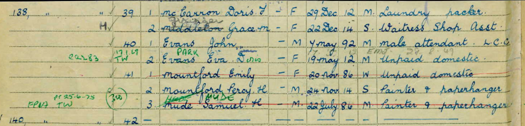 I was puzzled as to who John Evans was on this record and then I recalled seeing the name Evans on the 1939 register. So I looked through again and at the same address as Emily were a married couple John Evans b 7 May 1892 and Eva Doris Evans b 19 May 1912, John was her neighbour living at the same address, they were obviously close friends. Record below.